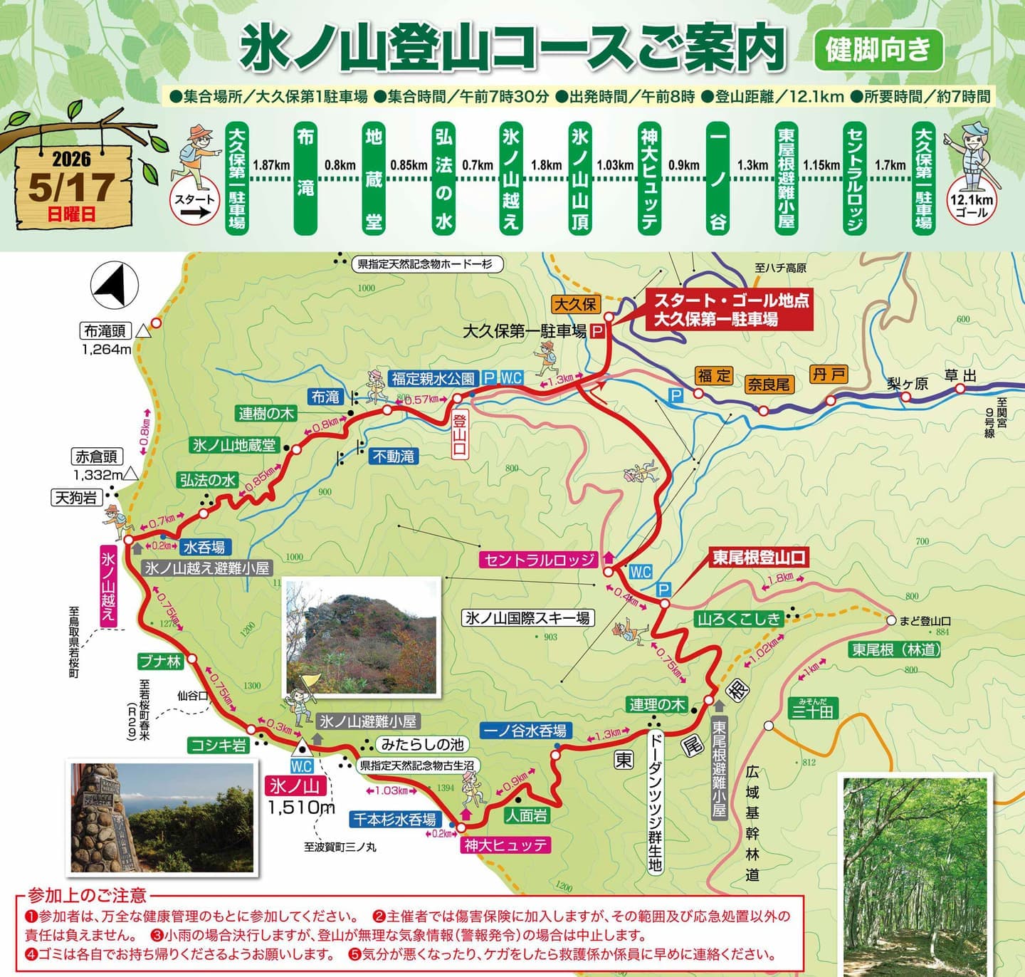 - 案内図参照、約12.1km、約7時間